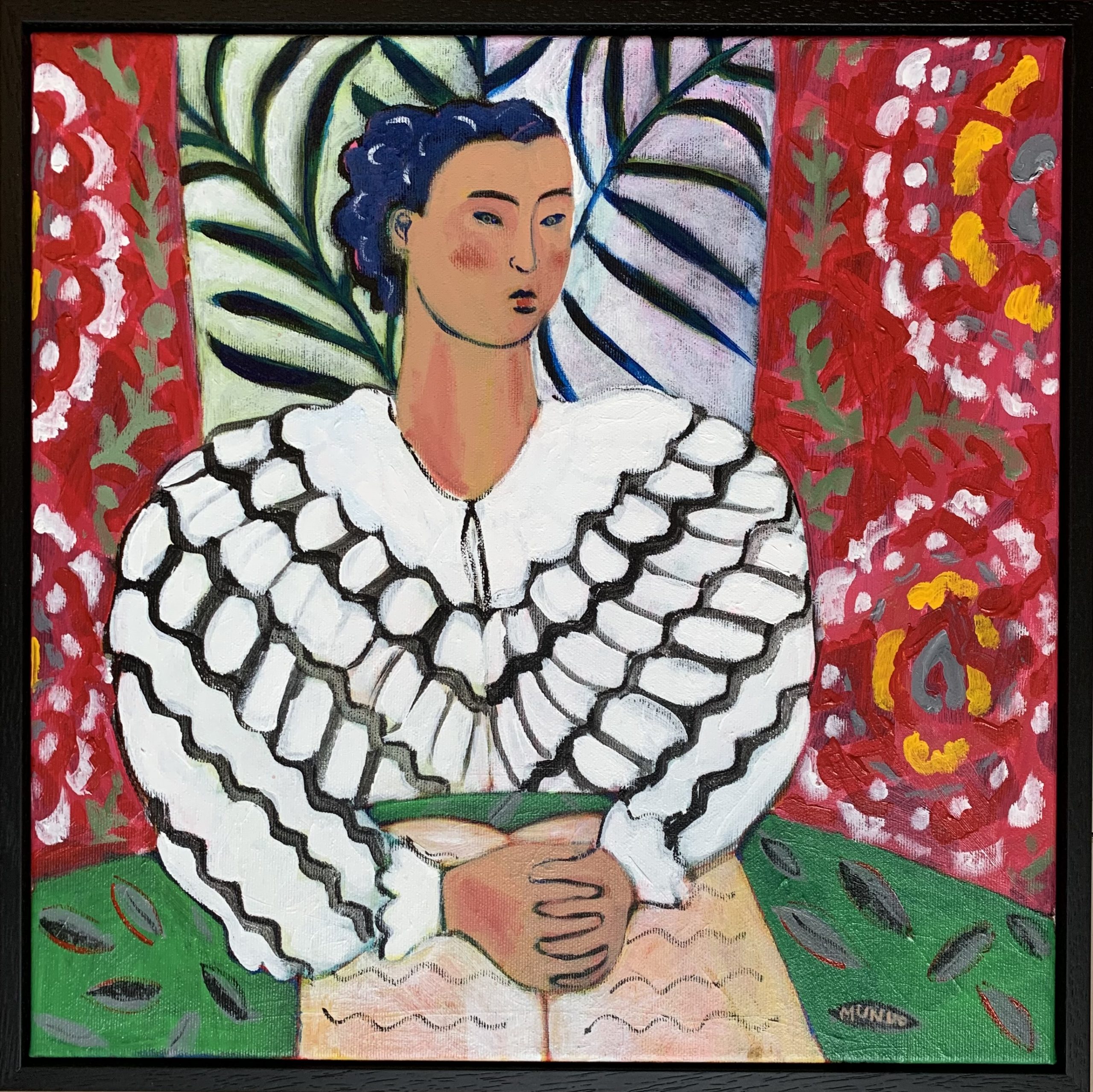 Naomi’s work is inspired by the modern masters, her family and interior settings. She observes and imagines scenes with objects and artefacts and assembles them around portraits of women, lost in thought or enjoying a mindful moment. Naomi enjoys the intensity of colour that can be achieved with acrylic paint, the fast-drying nature of it lends itself to the way she works, layering patterns on blocks of colour.